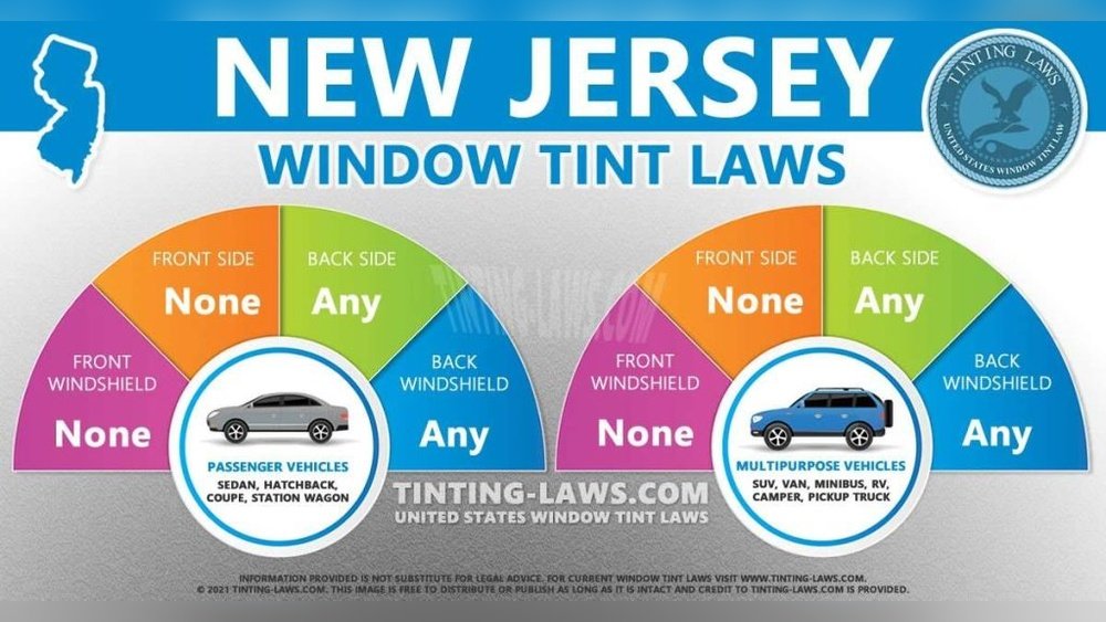 New Jersey law allows no tint on front side windows. Rear side windows and rear windshield can have any darkness. The visible light transmission (VLT) percentage must be 70% or higher for front windows. This means at least 70% of outside light must pass through.