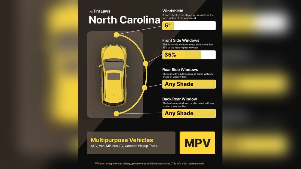 In North Carolina, rear side and rear windows can have any tint darkness. Front side windows must allow at least 35% visible light transmission (VLT). Medical exemptions apply for darker tints with proper permits.